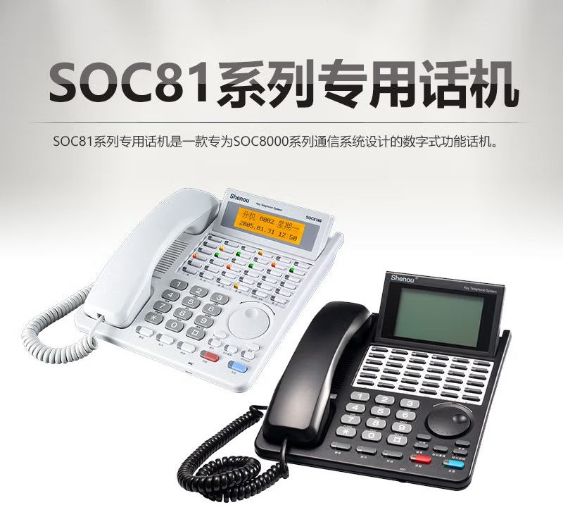 SOC81系列专用话机是一款专为SOC8000系列通信系统设计的数字式功能话机。采用双色模一次成型技术,键盘不易磨损、无缝连接等。同时可实现单键拨号、单键转接、通话保留、呼入等待、 通话切换、拒接来电、拒接转移、无应答转移、电话会议、经理秘书等功能。专用话机功能先进,外观精美,工艺精湛,是您办公的好选择。